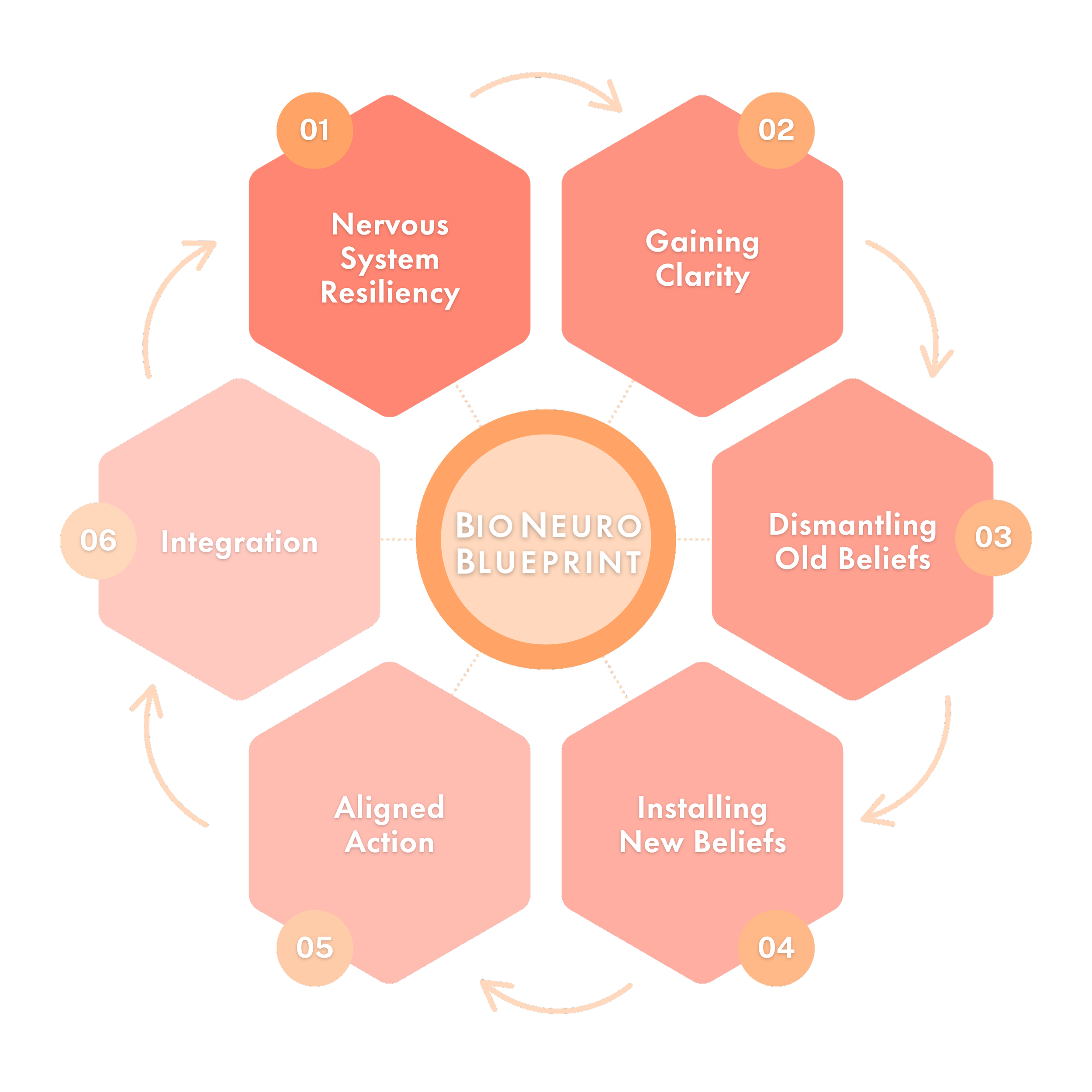 The framework focuses on six key areas: building nervous system resilience, gaining clarity, dismantling old beliefs, installing new ones, creating your future self, and integrating those changes. These elements work in harmony to facilitate deep, sustainable change across various aspects of life. The BioNeuro Blueprint™ framework’s circular design allows it to be applied repeatedly, adapting to any personal or professional challenge.